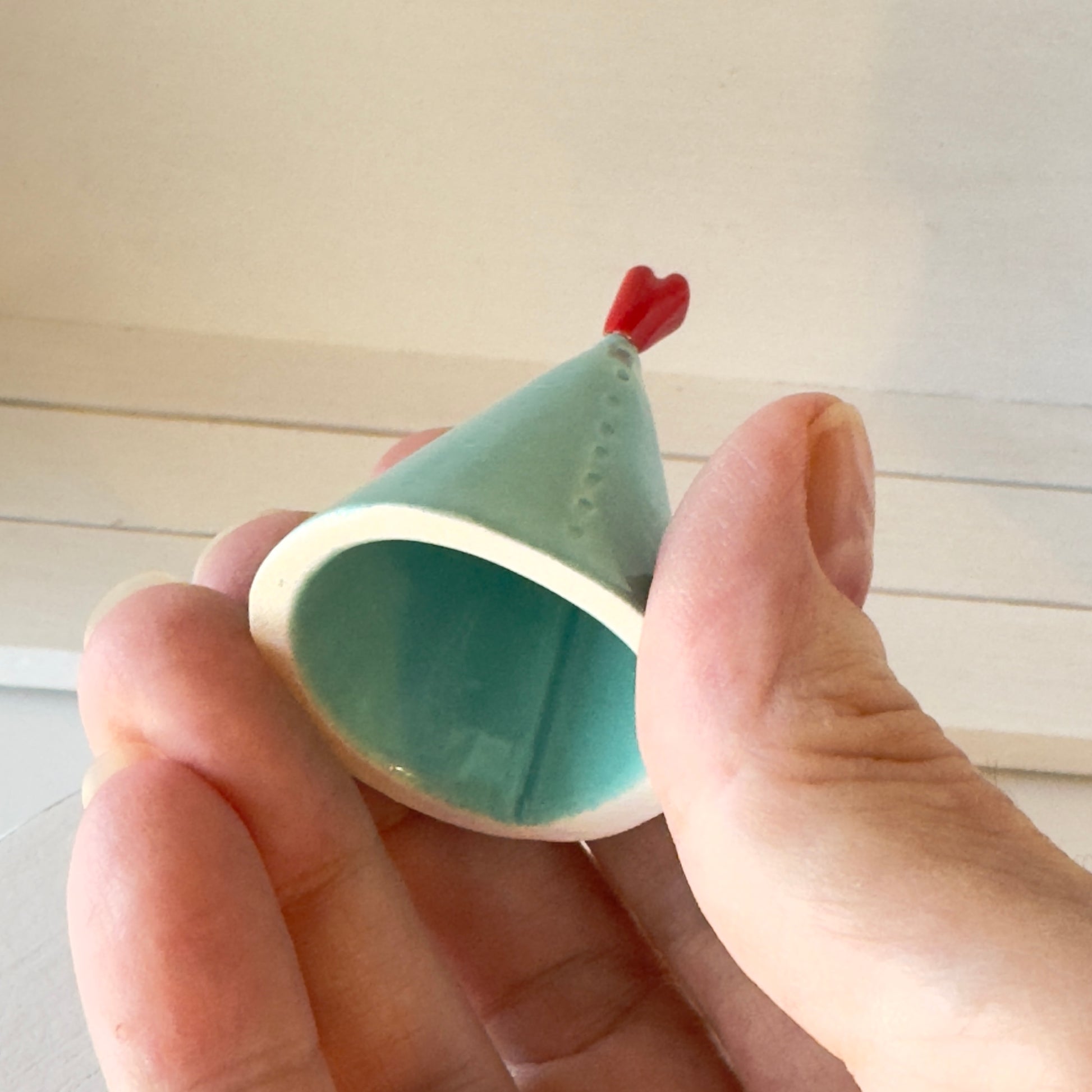 Tree - Aquamint colored cone shaped Christmas tree with red heart topper.