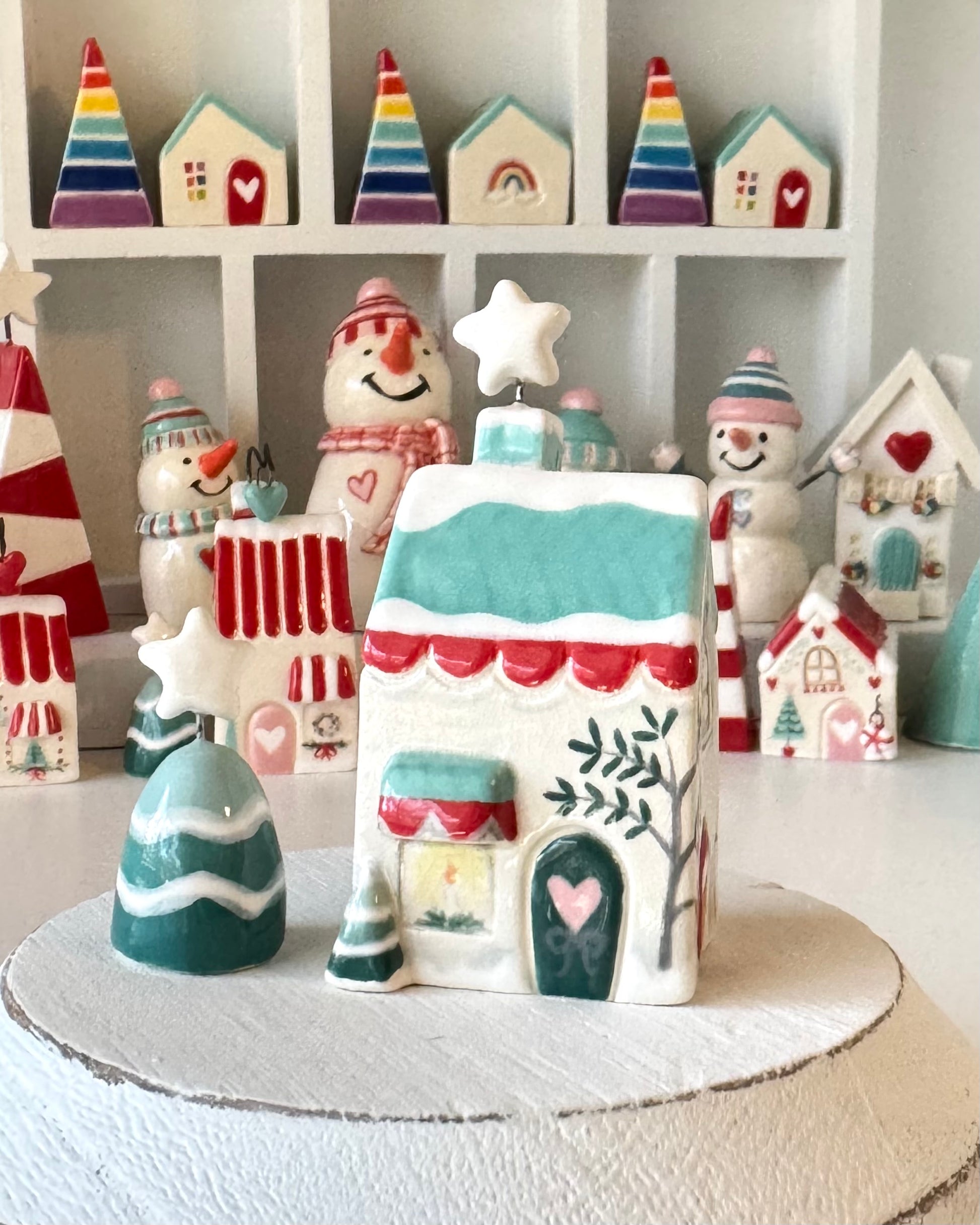 Winter Theme tiny house with star chimney topper and tiny tree.